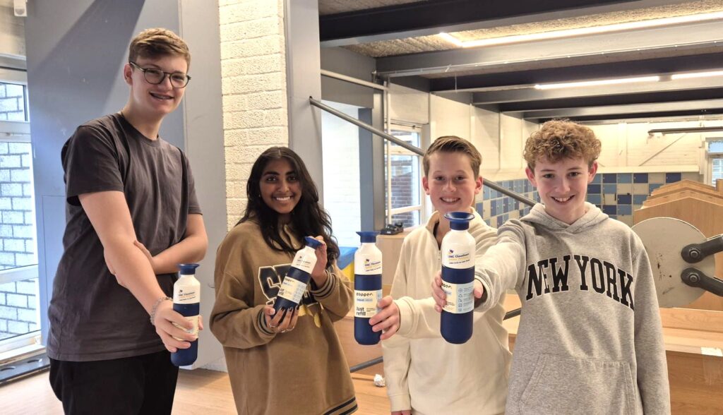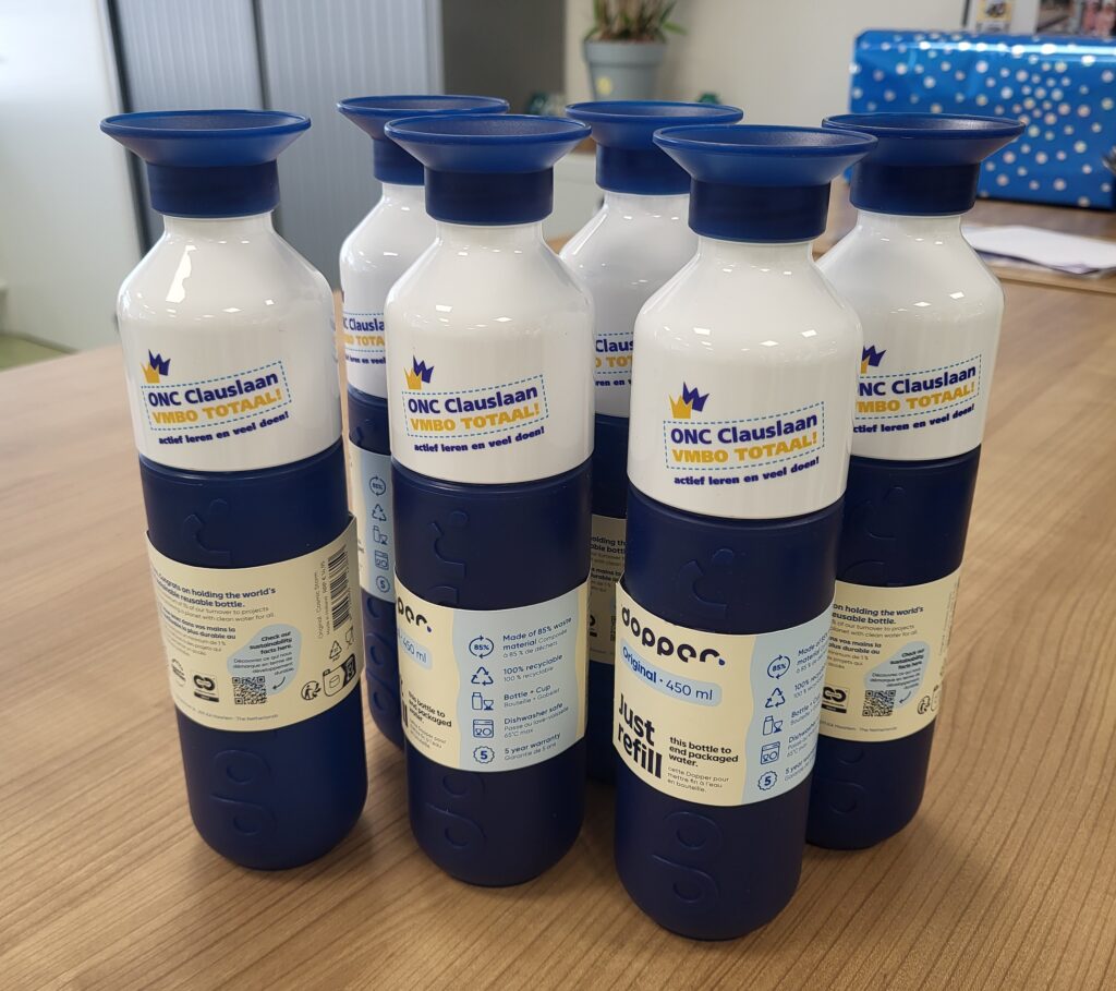 Al onze leerlingen hebben een eigen Dopper-fles gekregen, mogelijk gemaakt door het Jeugd Educatie Fonds. Binnenkort komt er een watertappunt in de centrale hal, zodat iedereen zijn fles gemakkelijk kan bijvullen!