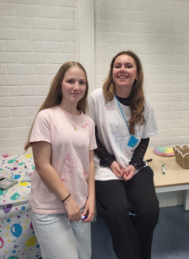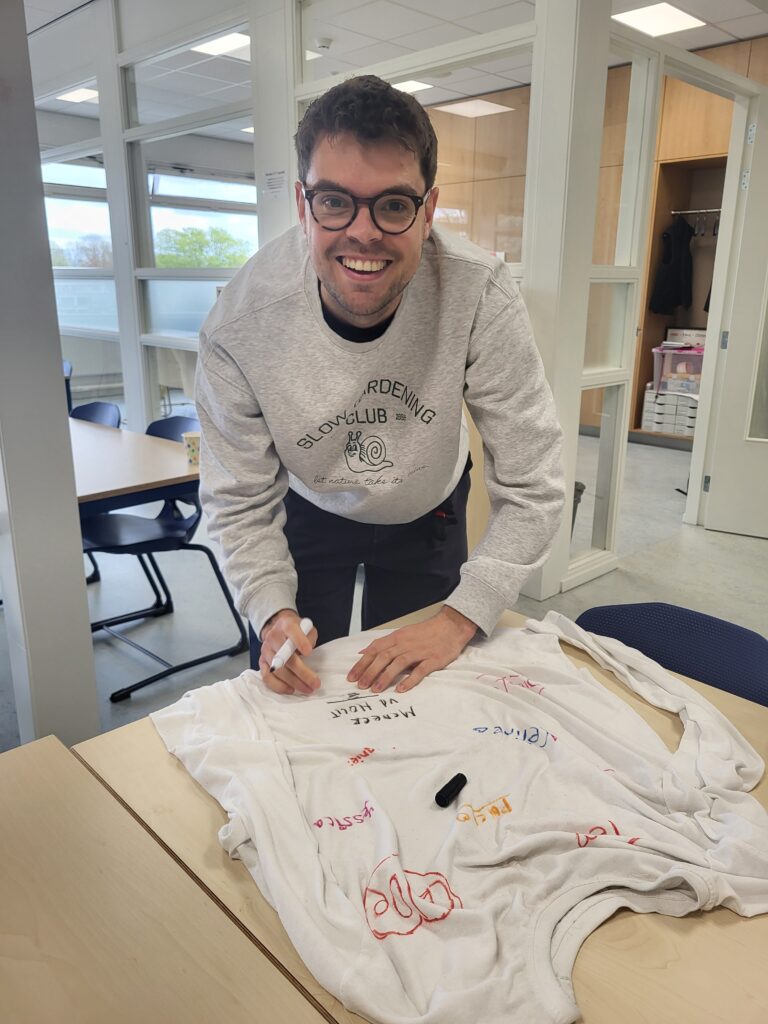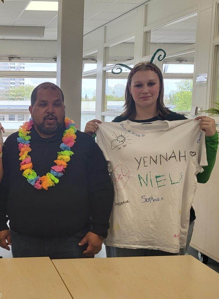 Op T-shirts schreven leerlingen en docenten hun naam. Zo nemen de leerlingen, ook na de examens, een tastbare herinnering mee.
