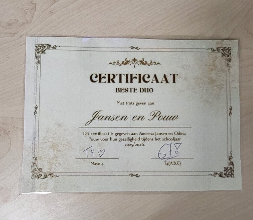 Vandaag was de laatste lesdag van onze mavo 4-leerlingen. Om dit te vieren verrasten zij hun docenten met een prachtig versierde afdeling en persoonlijke certificaten. Daarnaast hadden zij gezorgd voor een gezellige afsluiting met een hapje en een drankje, wat de dag extra feestelijk maakte.